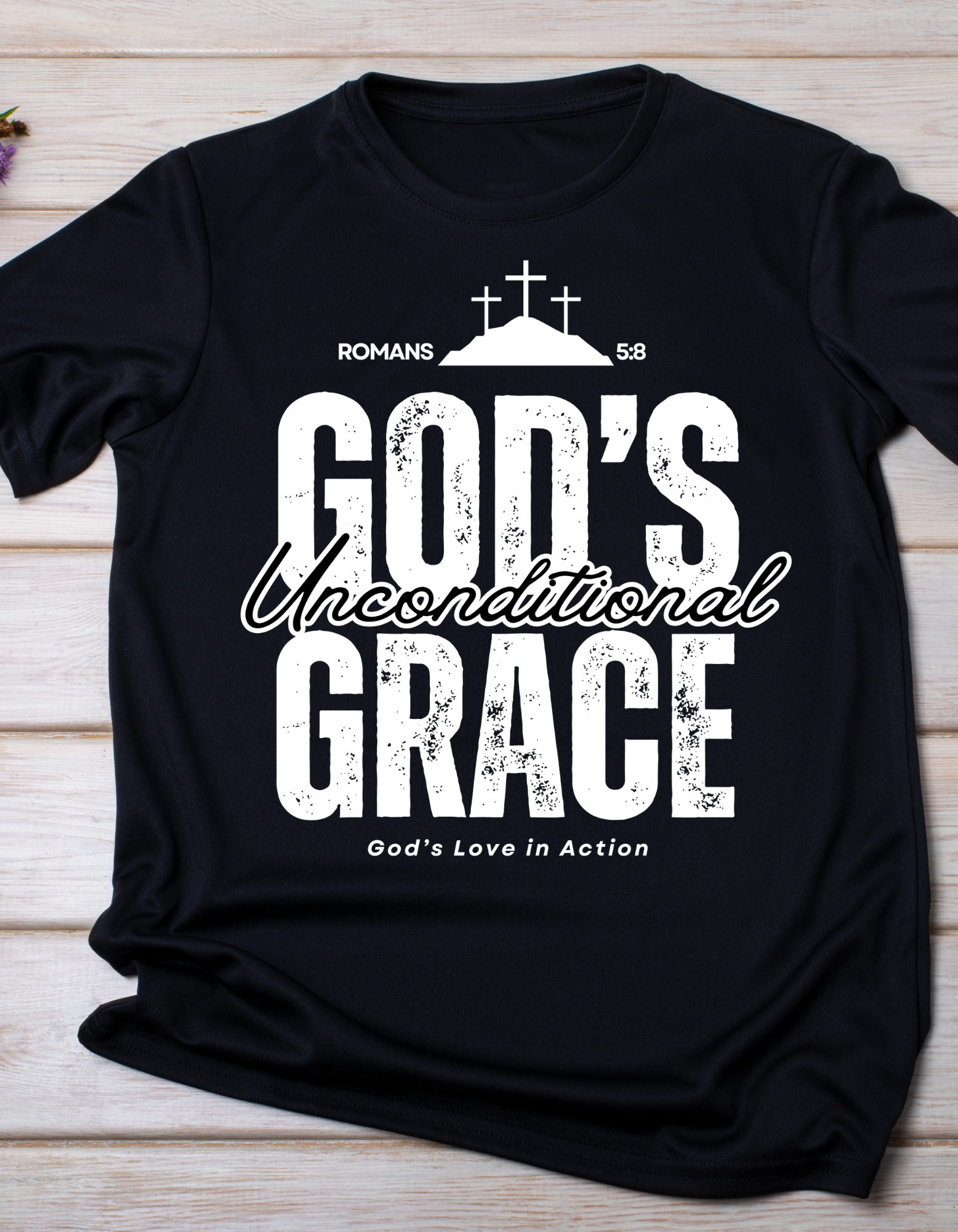 Wear a bold statement of faith with this powerful "Romans 5:8" T-shirt! Featuring three crosses on a hill, alongside inspiring text that reads "God's Unconditional Grace – God's Love in Action," this design serves as a daily reminder of divine love and redemption. The crisp white print on a black fabric ensures maximum contrast and impact, making it perfect for church events, casual wear, or as a meaningful gift for loved ones.